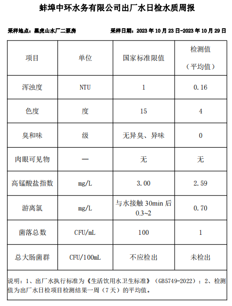 蚌埠中环水务有限公司出厂水日检水质周报(2023年10月23日-2023年10月29日)