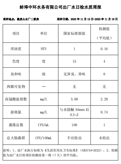 蚌埠中环水务有限公司出厂水日检水质周报(2023年11月13日-2023年11月19日)
